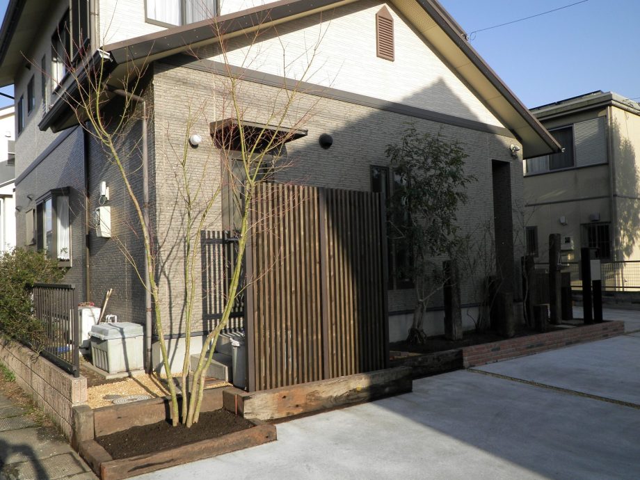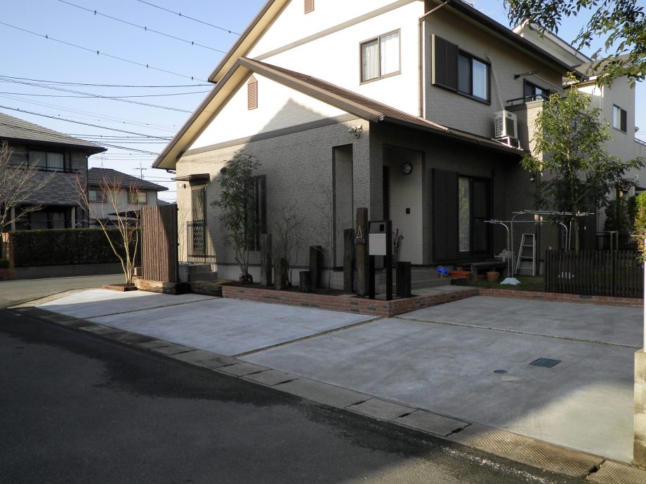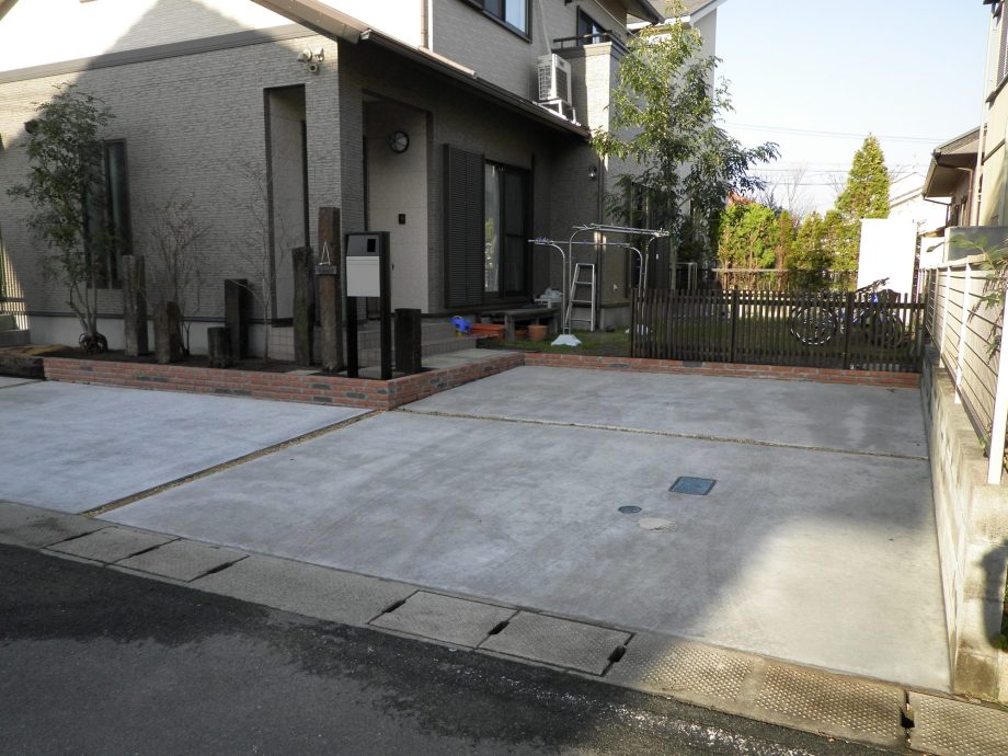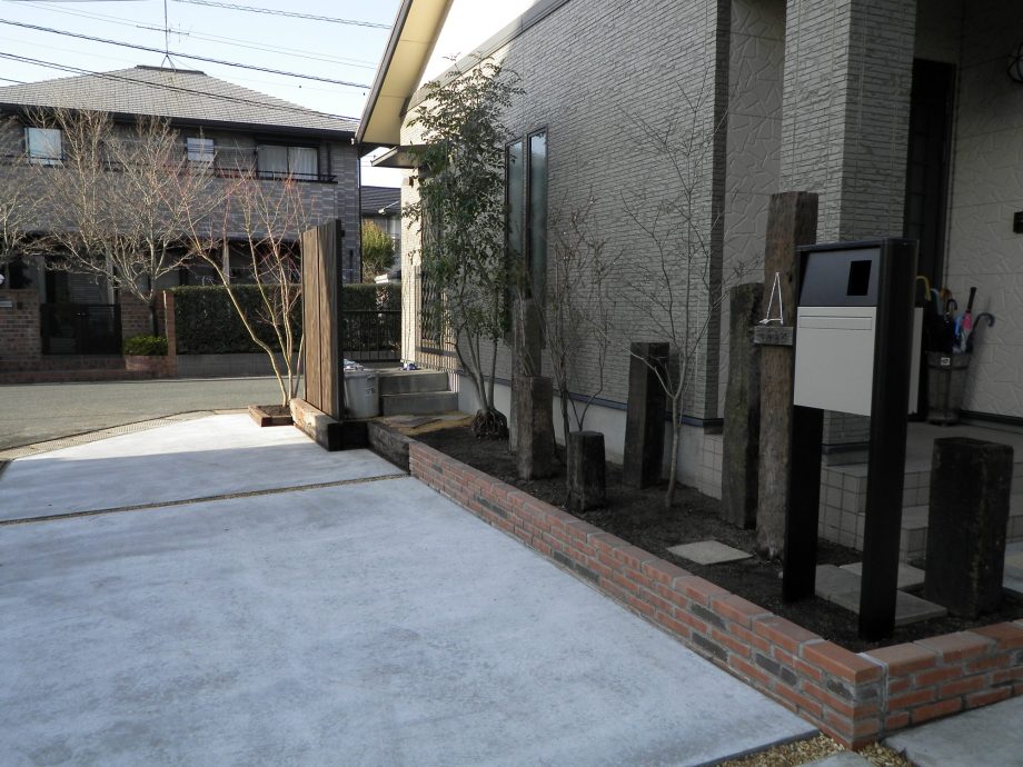 レンガや枕木・樹木はご自身のものを使用し駐車スペースとアプローチを造りました
