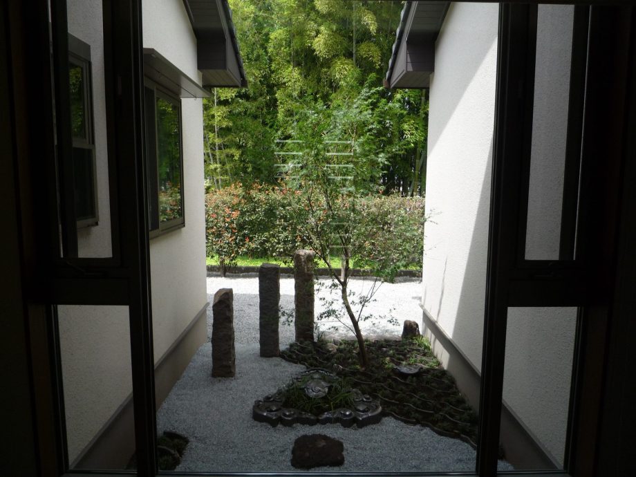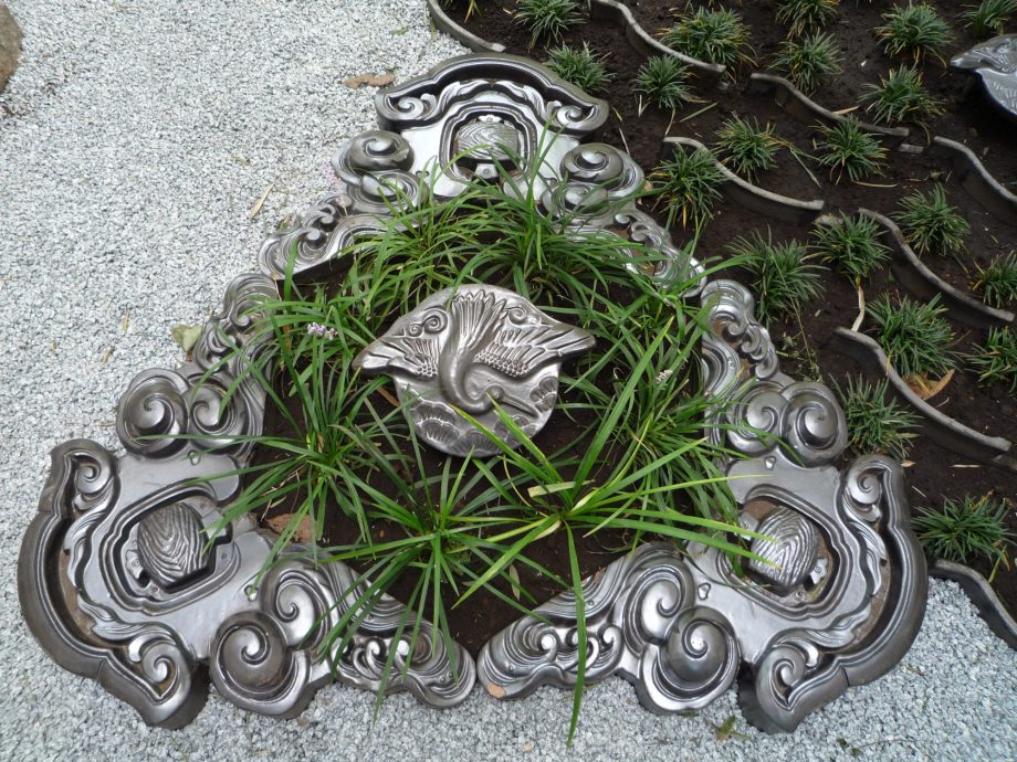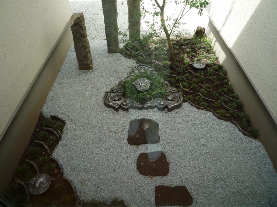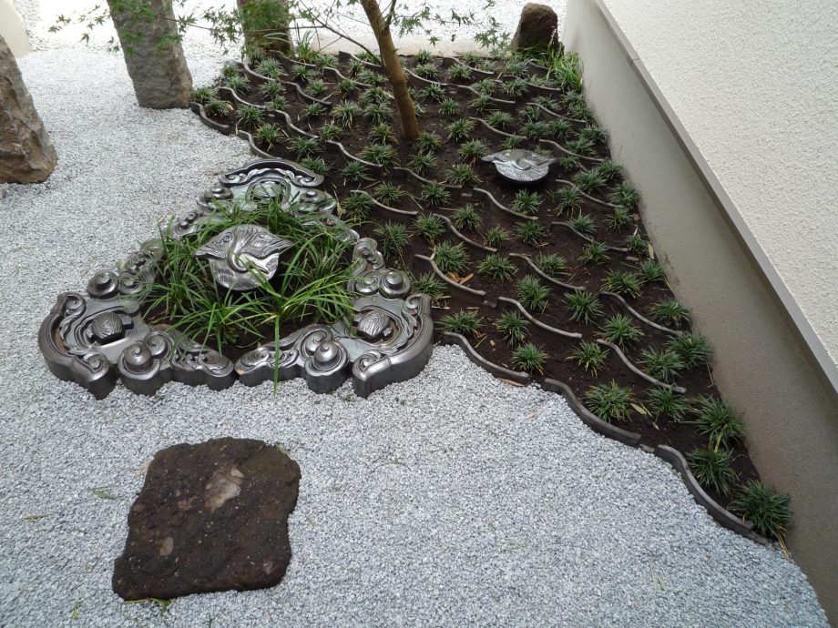 坪庭のアクセントは、以前のご自宅の鬼瓦を使用して瓦や立石も以前の物を使用しました。