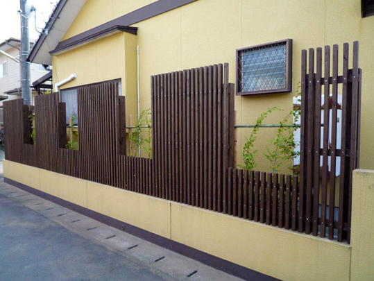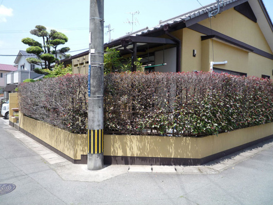 雑然とした印象を与えてしまっているじゅうぶんに手入れされていない生け垣から、涼しげな印象の格子垣が出来上がりました。格子の材木は、熊本産の杉。軟らかい木材ですが、防腐剤を注入加工しているので長持ちします。