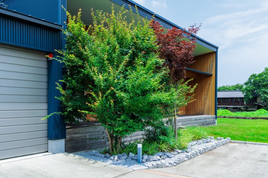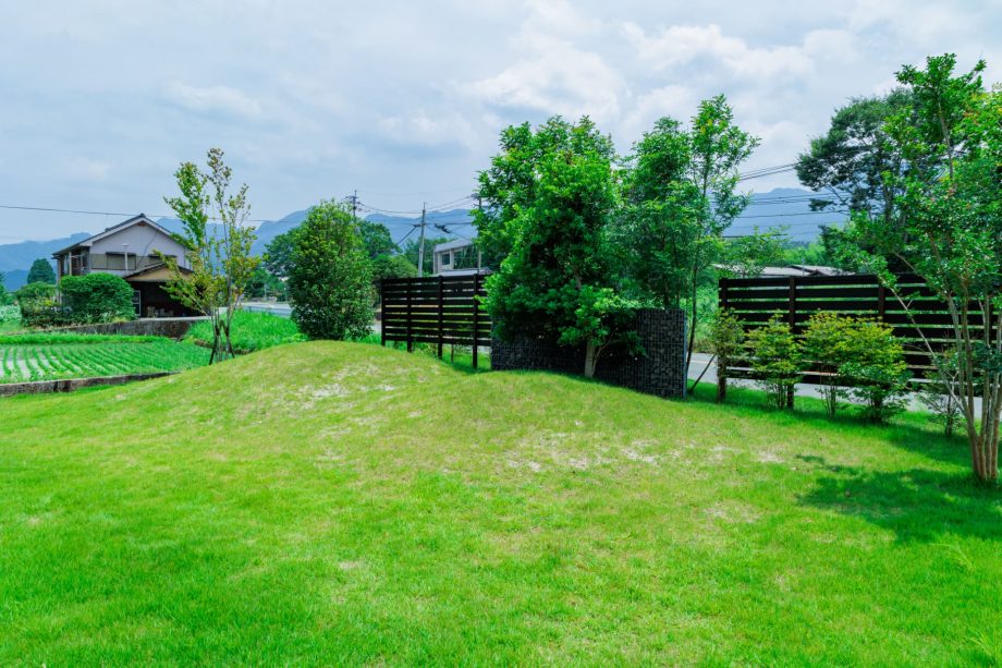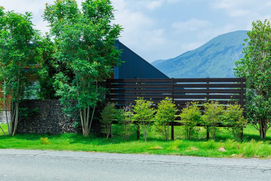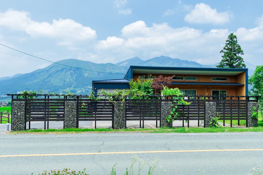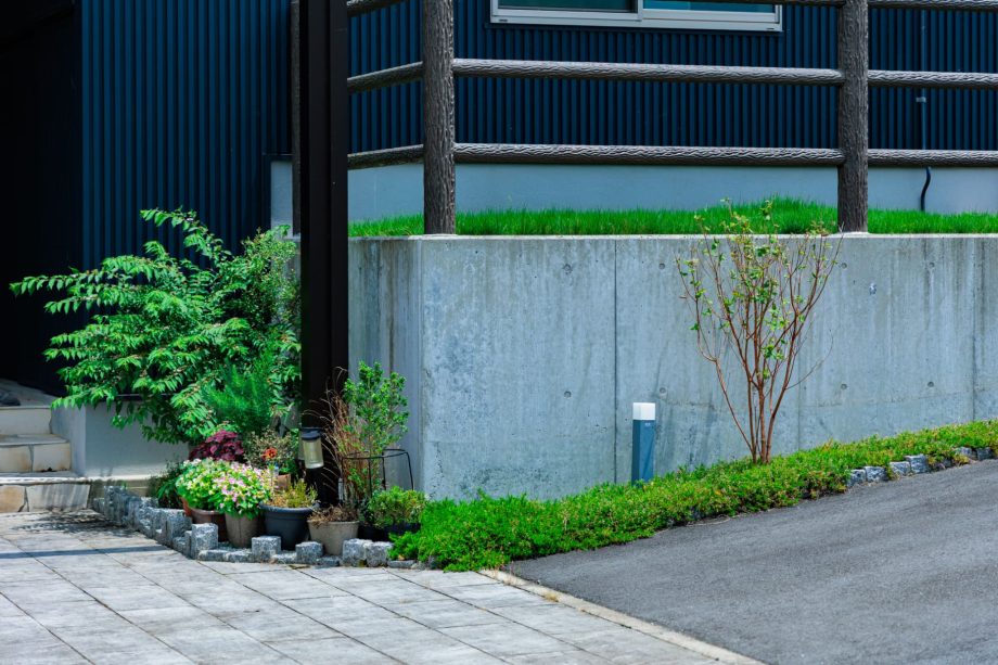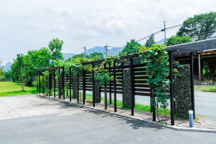 ご自宅の擁壁から舗装までトータルで施工。阿蘇の自然に溶け込むような外構を目指しました。道路側の目隠しを兼ねた造作パーゴラを『実りのコリドー』と名付け、自然と調和する安らぎの空間を創出しました。